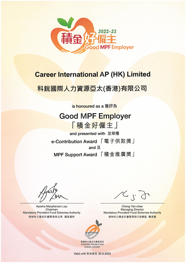 近期,香港强制性公积金计划管理局(积金局)成功举办“积金好雇主”颁奖典礼,并现场揭晓上榜雇主名单,旨在嘉奖当地致力于关顾员工退休福利的模范雇主。凭借对于员工福祉的关注和企业社会责任的践行,bifa必发官网国际香港分公司陆续在三年获评“积金好雇主”殊荣,并同时获颁“电子供款奖”及“积金推广奖”。